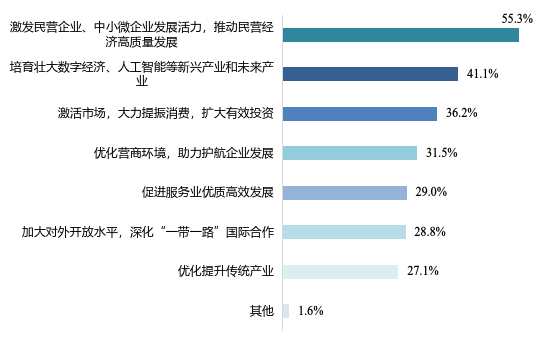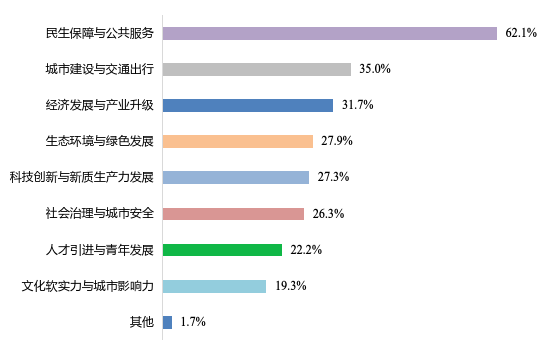 与此同时,优化营商环境、提升服务业质量、深化对外开放、推动传统产业升级等方面也受到广泛关注,关注度分别达到31.5%、29.0%、28.8%、27.1%。这些期盼共同指向一个目标——构建更具韧性、创新力和开放性的现代化经济体系,以多维度活力驱动城市能级实现全面跃升。