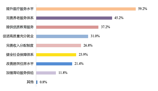 作为公众最殷切的期盼领域,民生保障与公共服务的关注重心集中于医疗、养老、教育三大核心场景。同时,促进高质量充分就业、完善收入分配制度、健全社会保障体系、改善居民住房条件、加强育幼服务供给等方面的诉求也较为突出。