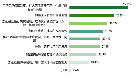 在医疗领域,公众的诉求聚焦于制度完善与服务质量双提升。55.8%的受访者期待进一步完善医保制度,扩大医保覆盖范围,从根源上缓解“就医贵”难题;42.2%的受访者希望加强医疗质量与安全监管,筑牢医疗服务安全防线;36.2%的受访者呼吁强化基层医疗机构建设,推动优质医疗资源下沉,全面提升基层诊疗水平,让群众在家门口就能享受到优质服务。