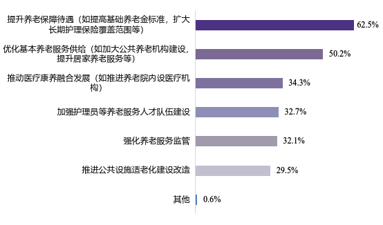 养老领域的期盼则围绕提升保障待遇与优化服务供给展开。62.5%的受访者期盼着提高基础养老金标准、扩大长期护理保险覆盖范围,进一步夯实养老保障根基;50.2%的受访者希望加大公共养老机构建设力度,丰富居家养老服务供给,满足多样化养老需求;34.3%的受访者呼吁推进医养康养深度融合,支持养老机构内设医疗机构,实现养老服务与医疗保障无缝衔接。