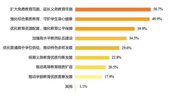 教育领域呈现出“公平”与“素质”并重的追求趋势。50.7%的受访者期待扩大免费教育范围,延长义务教育年限,让更多孩子共享优质教育资源;49.9%的受访者关注综合素质教育的强化,呼吁守护学生身心健康,促进德智体美劳全面发展;39.9%的受访者希望优化教育资源配置,缩小区域、校际差距,切实促进教育公平。