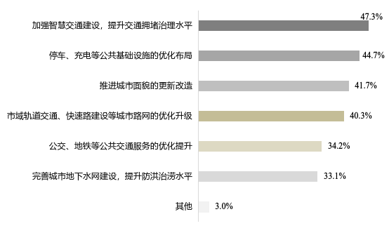 便民化需求同样占据重要位置,44.7%的受访者希望优化停车、充电等公共基础设施布局,40.3%的受访者期待城市路网进一步优化升级,34.2%的受访者呼吁持续提升公共交通服务水平,全方位满足市民日常出行需求。