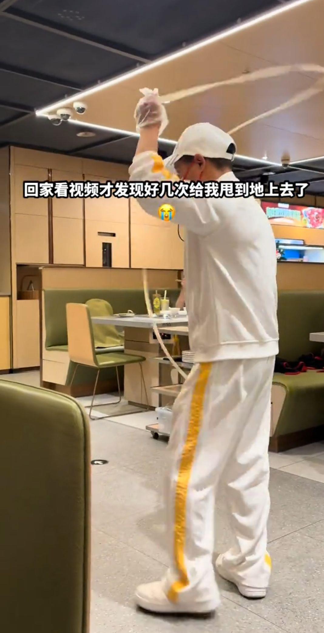 极目新闻记者搜索发现,邱先生在社交媒体上发布了两条视频。第一条视频发布于12月25日,视频中,海底捞一名戴着口罩和帽子的男工作人员表演甩制捞面的过程,配发文字称:“回家看视频,才发现好几次甩到地上去了。”极目新闻记者注意到,面条确实有几次被甩到地上。