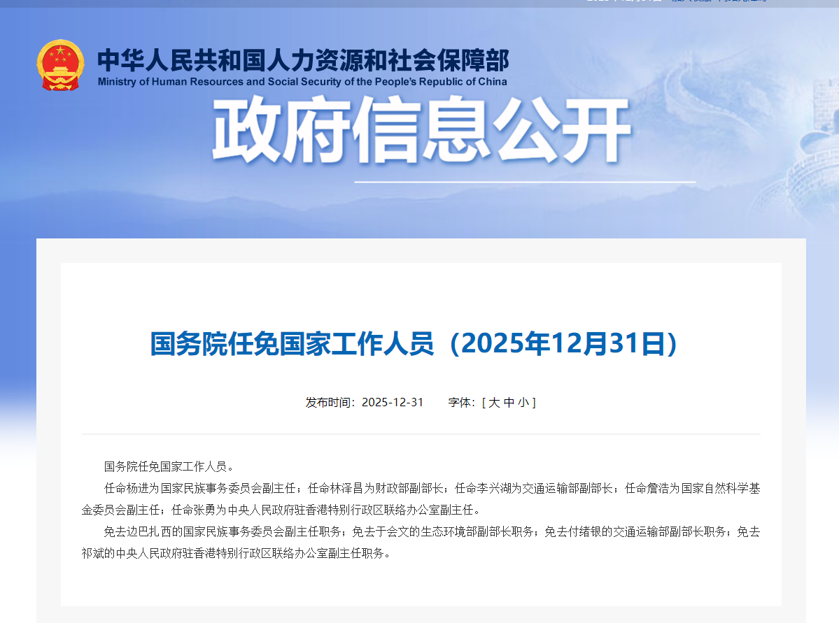 任命杨进为国家民族事务委员会副主任;任命林泽昌为财政部副部长;任命李兴湖为交通运输部副部长;任命詹浩为国家自然科学基金委员会副主任;任命张勇为中央人民政府驻香港特别行政区联络办公室副主任。