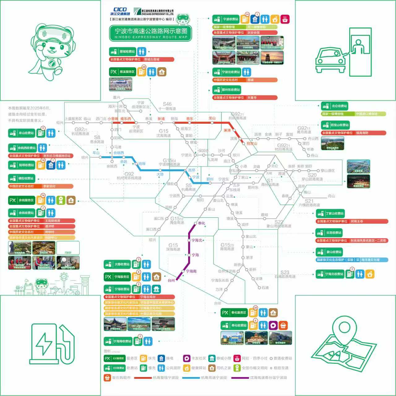 记者看到,该地图涵盖了宁波主要高速路网图,标注了宁波辖区内各高速收费站、服务区的具体位置,详细列明了充电桩配置数量、卫生间、便民服务岗亭、司机之家、卡友社区、暖心热食供给等便民服务细节。