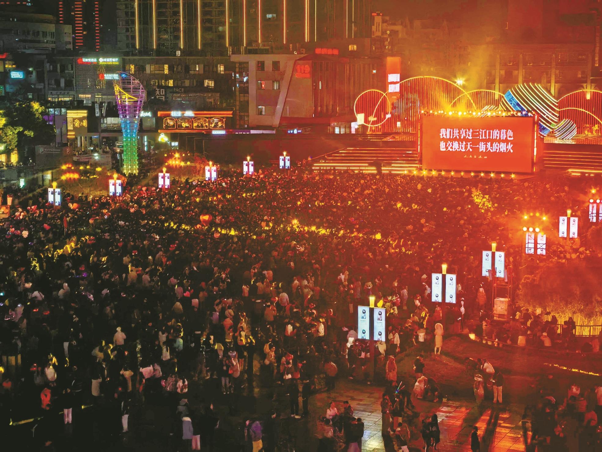 广场上的巨幕大屏同步点亮,与气球构成的空中画卷交相辉映。