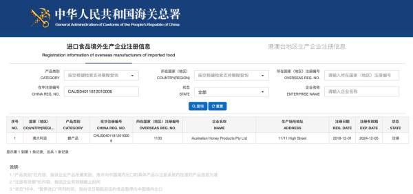 查询上述“俄罗斯蜂王浆”生产企业在华注册编号下显示是一家已经注销的澳大利亚公司。海关总署官网截图