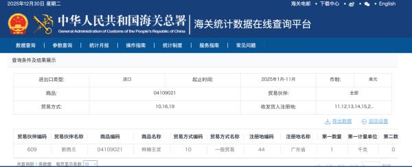 海关数据显示,2025年我国鲜蜂王浆进口仅为1千克,来自新西兰。