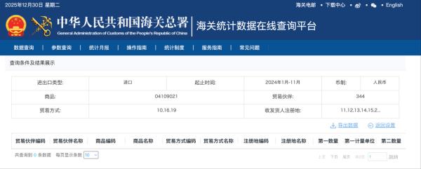 海关数据显示,2024年我国没有进口鲜蜂王浆。