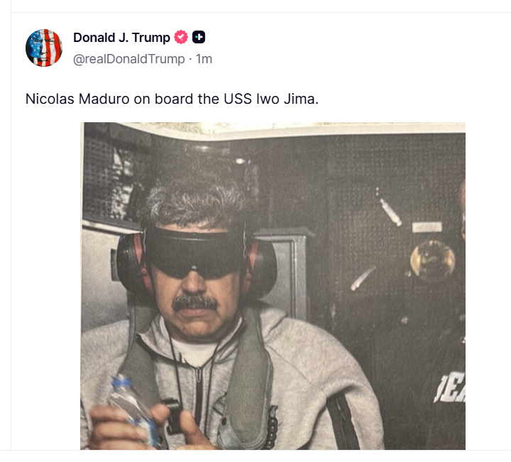 记者会前,特朗普在社交媒体发布马杜罗在美军舰上戴手铐、双眼被蒙住的照片