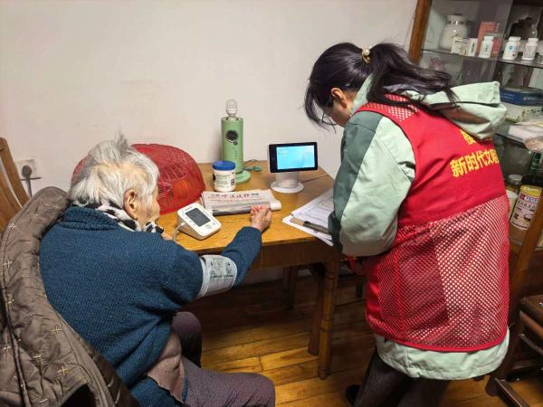 志愿者给老人量血压