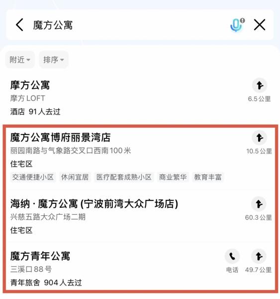 高德地图搜索“魔方公寓”显示结果。