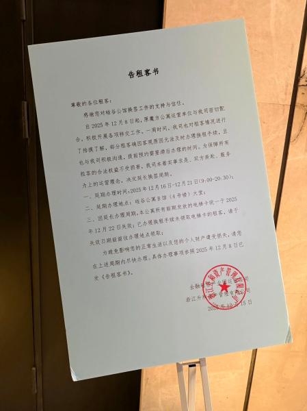 “2025年12月7日,我们突然接到通知,称魔方公寓将不再运营该处公寓,租赁关系将强制变更为由浙江升和资产管理有限公司,2025年12月8日,升和资管张贴告示,称2025年12月15日前必须与魔方公寓办理退租,与升和资管重新签合同,否则清退”;