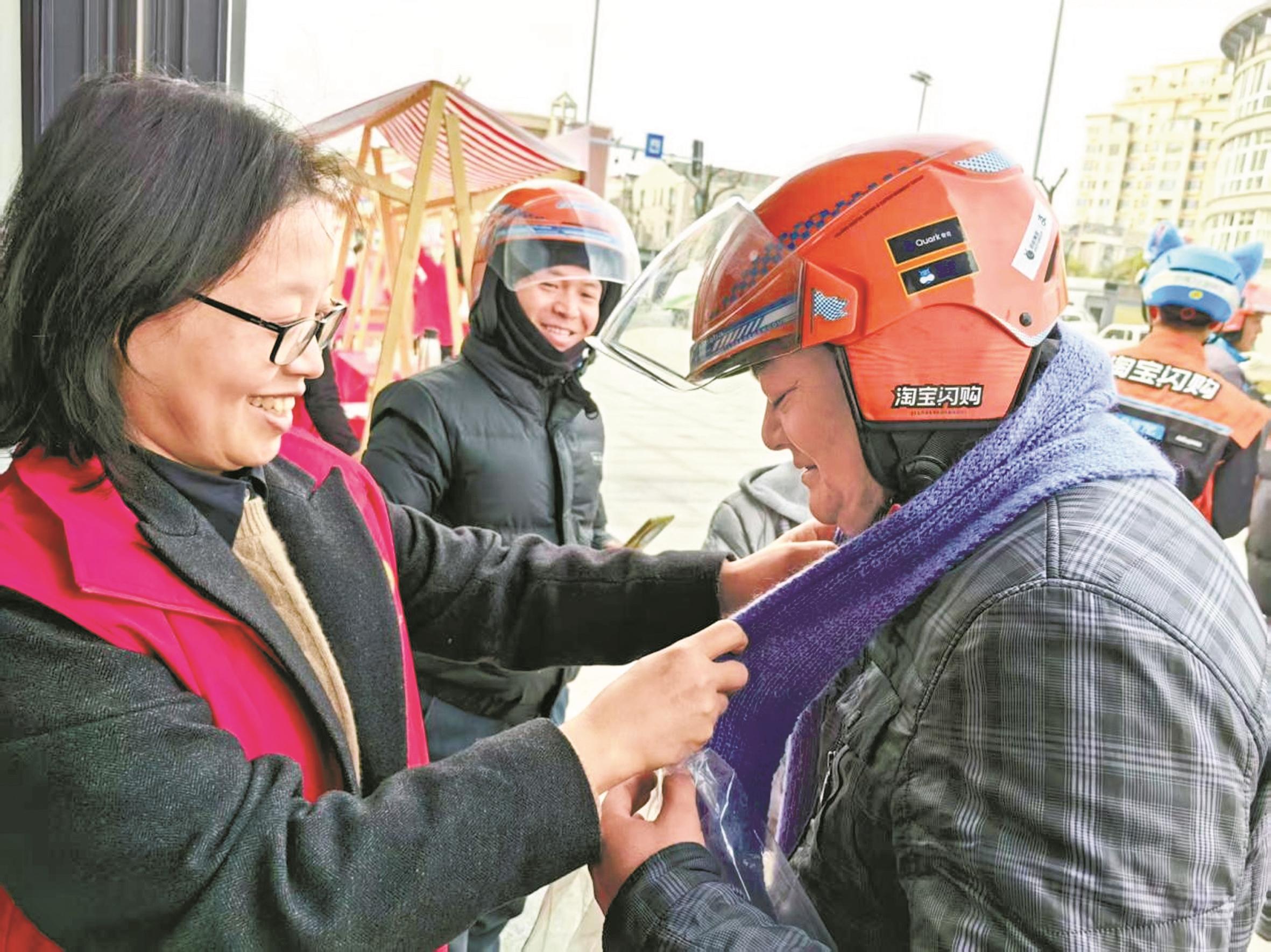 近日,在前湾新区庵东镇总工会举办的“暖‘新’跨年 工会同行”活动现场,外卖骑手马燕聪和同伴们围上了“歇歇脚”户外劳动者驿站志愿者亲手编织的围巾。这些常年奔波在街头的“城市超人”,收到了一份特别的温暖。“城市超人”守护计划已陪伴甬城三年。庵东镇总工会负责人胡雪青表示,未来驿站将继续依托志愿者团队的力量,优化服务体验,让工会驿站成为户外劳动者最坚实、最温暖的“避风港”。(郭婷茜 陈松 阮荧炯 摄)