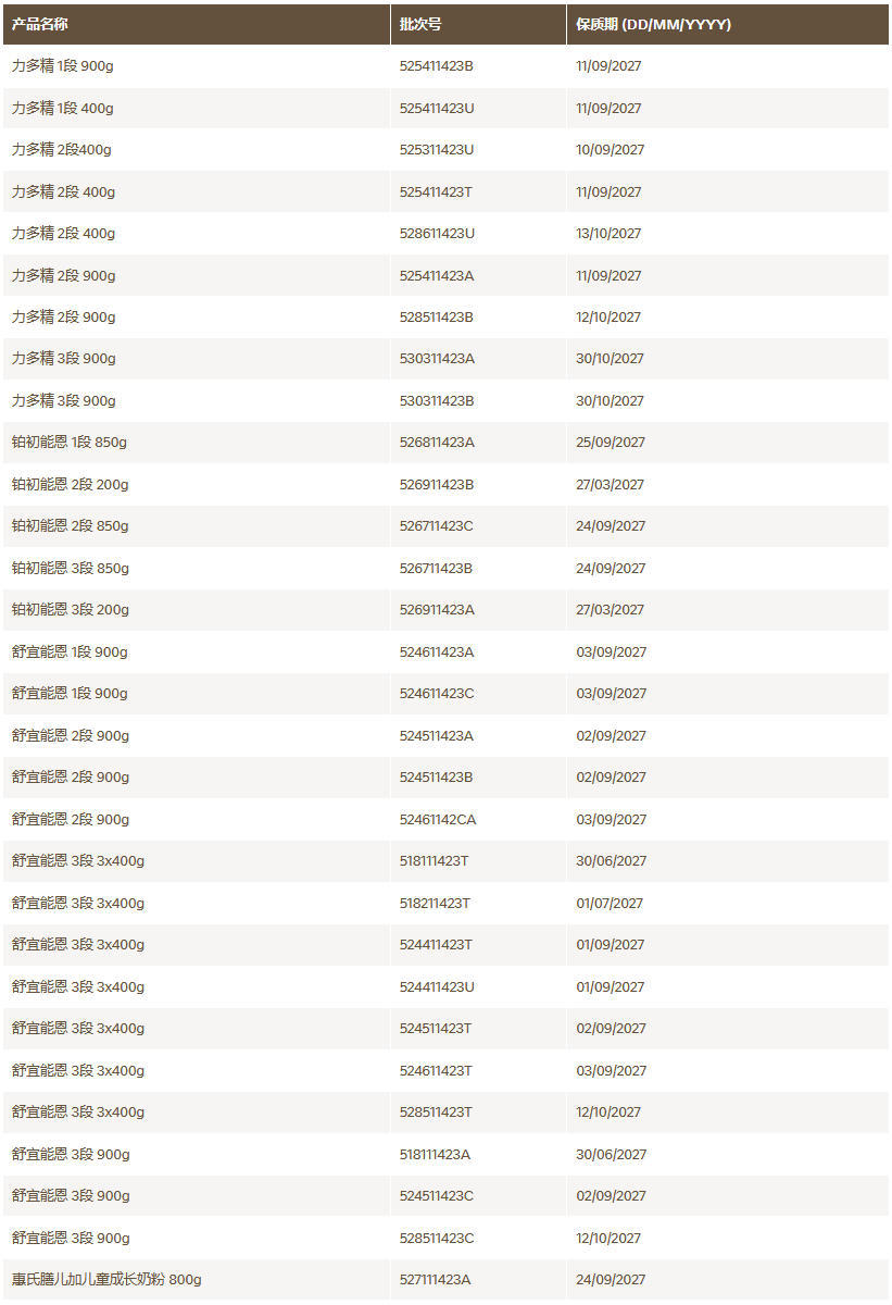 雀巢中国官网发布的“预防性自愿回收婴幼儿配方奶粉”公告披露了需要召回的产品批次,涉及力多精、铂初能恩、舒宜能恩、惠氏等多批次产品。公告称,自愿回收所有此次涉事的进口自欧洲、在中国大陆跨境电商渠道销售的婴幼儿配方奶粉。本次回收范围之外的所有其他雀巢产品及同类产品的其他批次均可安全食用。