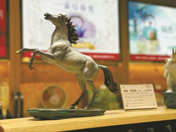 位于天一广场的朱炳仁门店,展示着多款联名款骏马摆件,如朱炳仁联名故宫文创推出的“乾隆八骏之腾雾”马摆件姿态昂扬,出自清宫廷画师郎世宁《八骏图》;朱炳仁联名敦煌研究院推出的“飞黄腾达”马摆件,则有“天马行空来,腾达万里去”的飞天之姿,吸引了不少消费者驻足挑选。