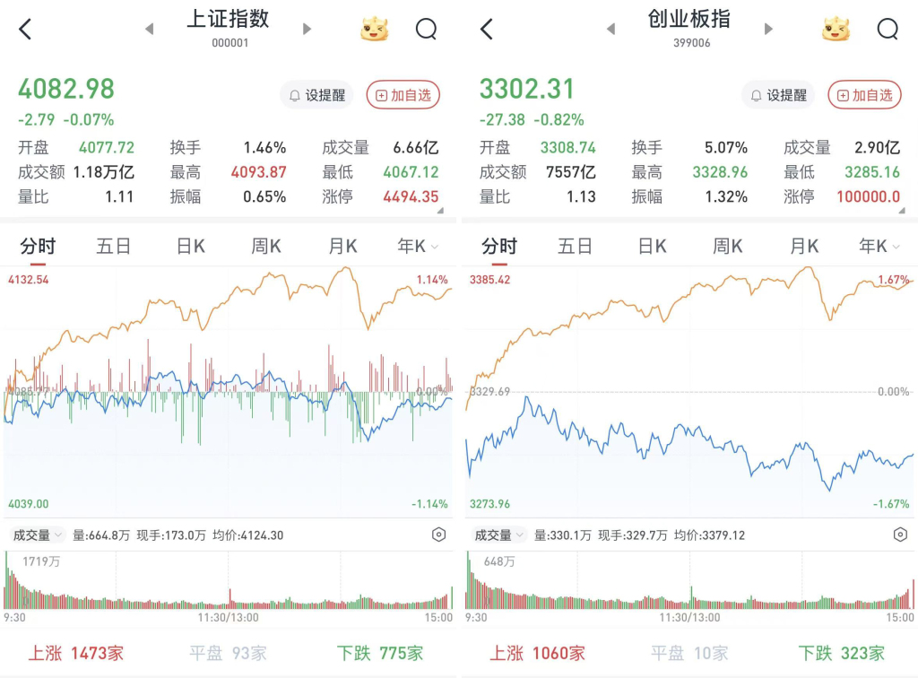 至收盘,上证综指跌0.07%,报4082.98点;科创50指数涨0.82%,报1455.17点;深证成指跌0.51%,报13959.48点;创业板指跌0.82%,报3302.31点。