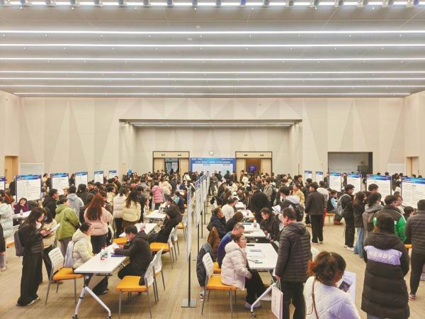 1月8日,中国科学院大学宁波材料工程学院阅微楼三楼报告厅内人声鼎沸,求职者手持简历围在展位前与相关企业招聘负责人深入交流。