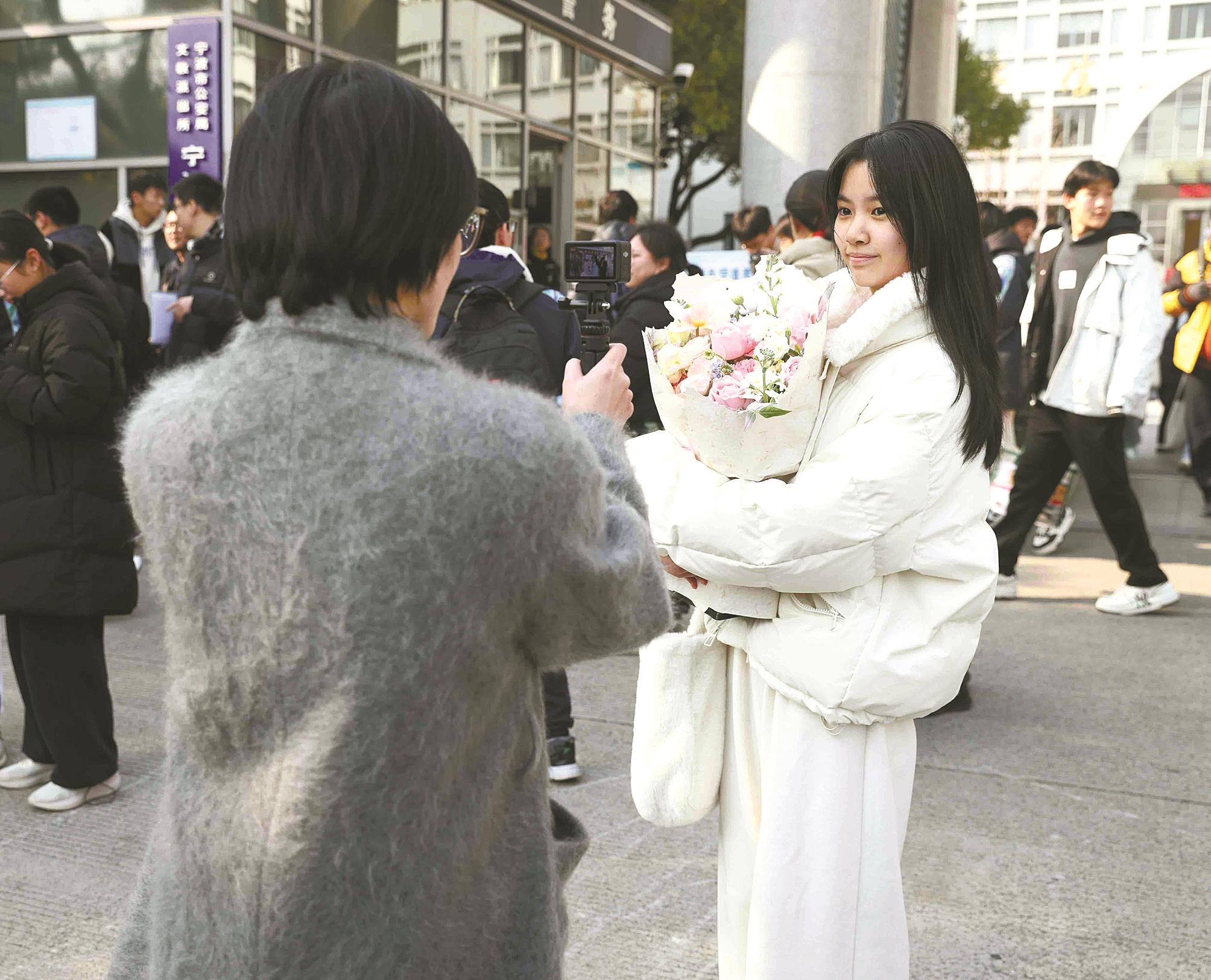 人群中,手捧向日葵与玫瑰的卢女士格外引人注目。“特意选了向日葵和玫瑰,寓意‘金榜题名、心想事成’。”她希望通过这份“仪式感”为孩子加油,“女儿平时学习很努力。我们家长主要负责后勤保障,这几天的饭菜都做得清淡但富有营养,希望她能以最好的状态完成每一场考试”。