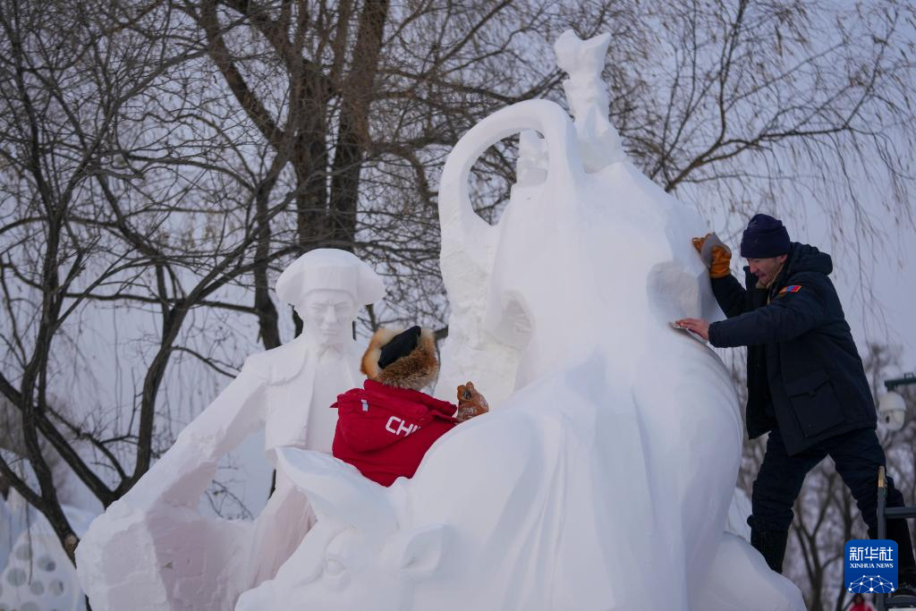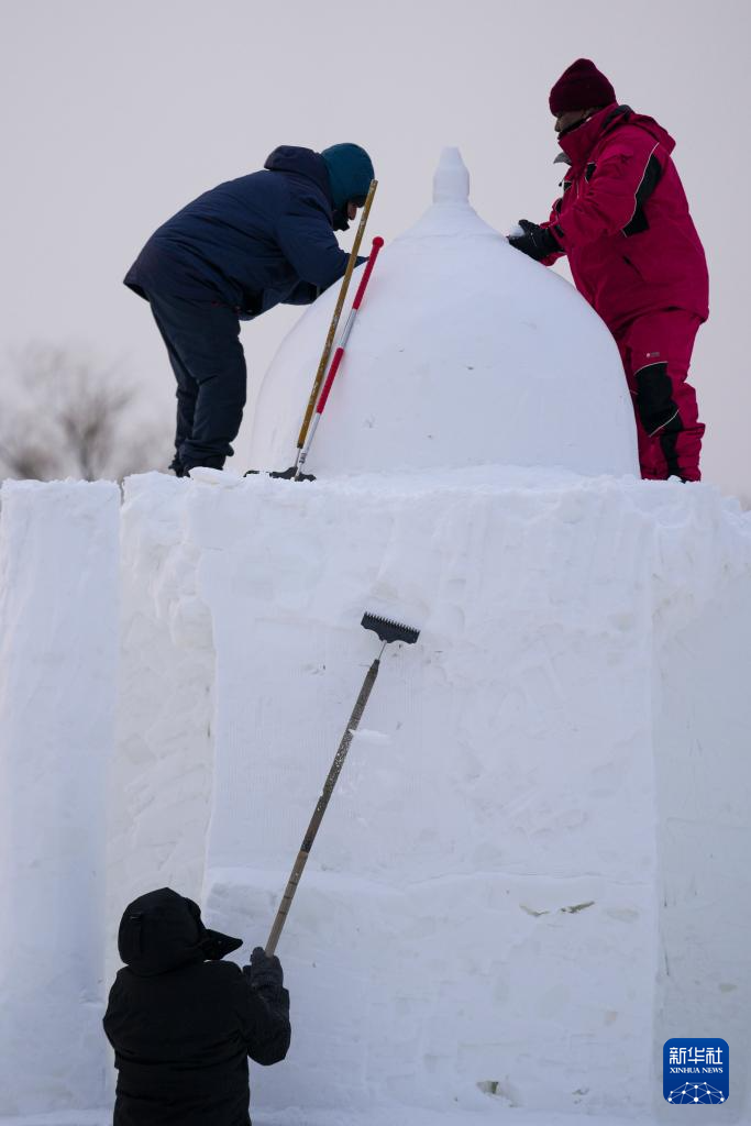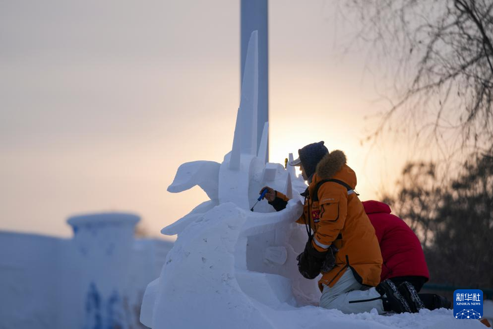 1月8日,在哈尔滨太阳岛雪博会第28届中国·哈尔滨国际雪雕比赛现场,选手进行雪雕创作。新华社记者 王建威 摄