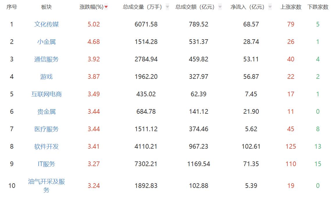 板块方面,文化传媒、小金属、通信服务等涨幅居前,保险、机场航运、厨卫电器等跌幅居前。