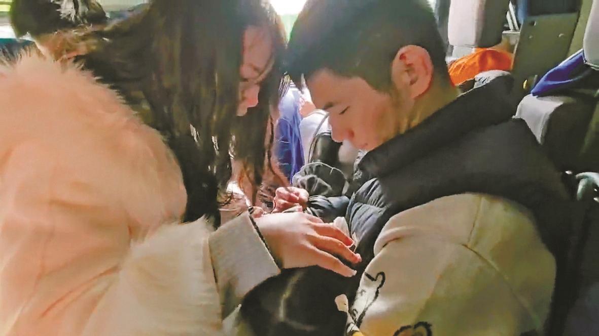 陈立新与妻子在消防车上照顾受伤女童。通讯员供图