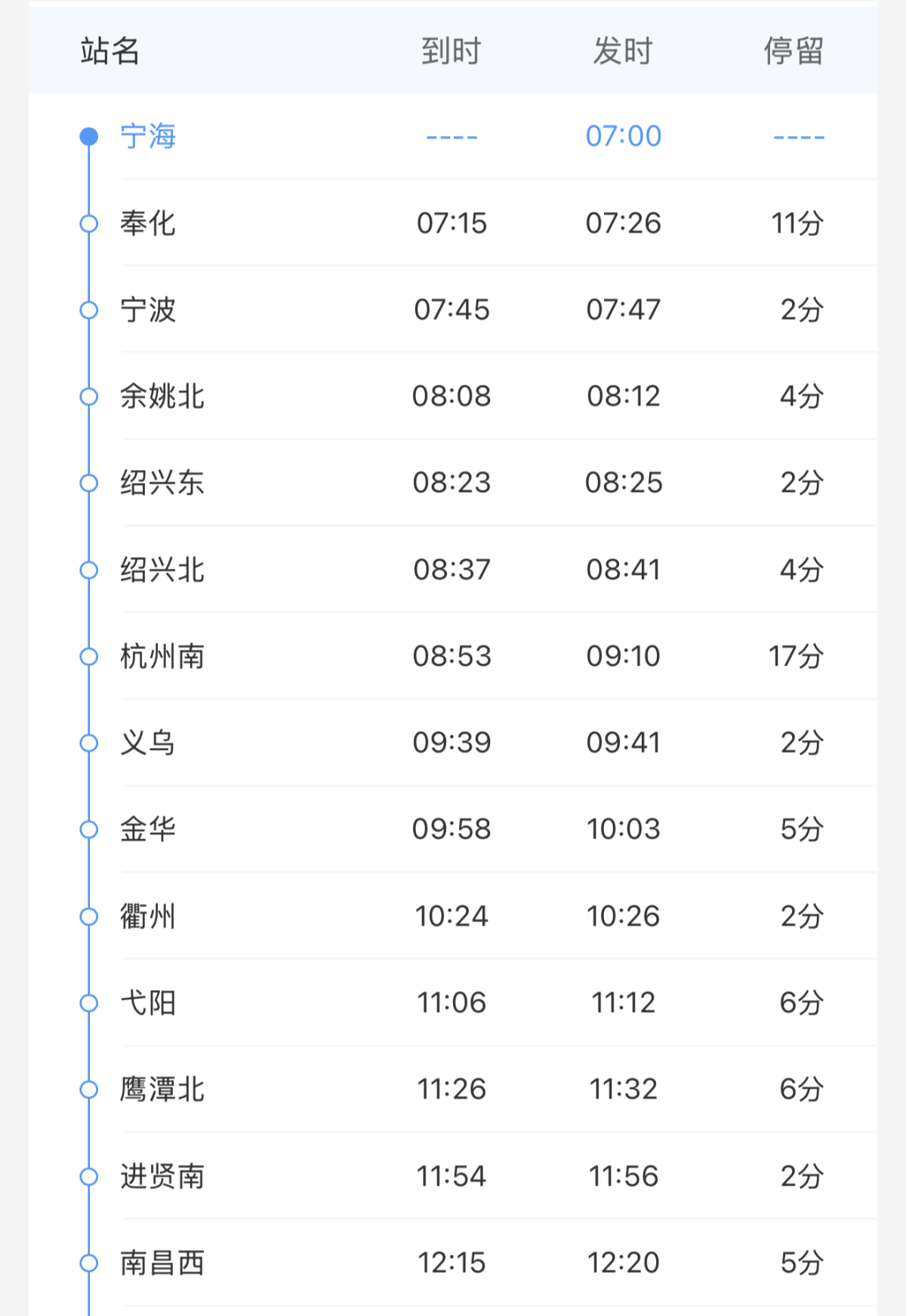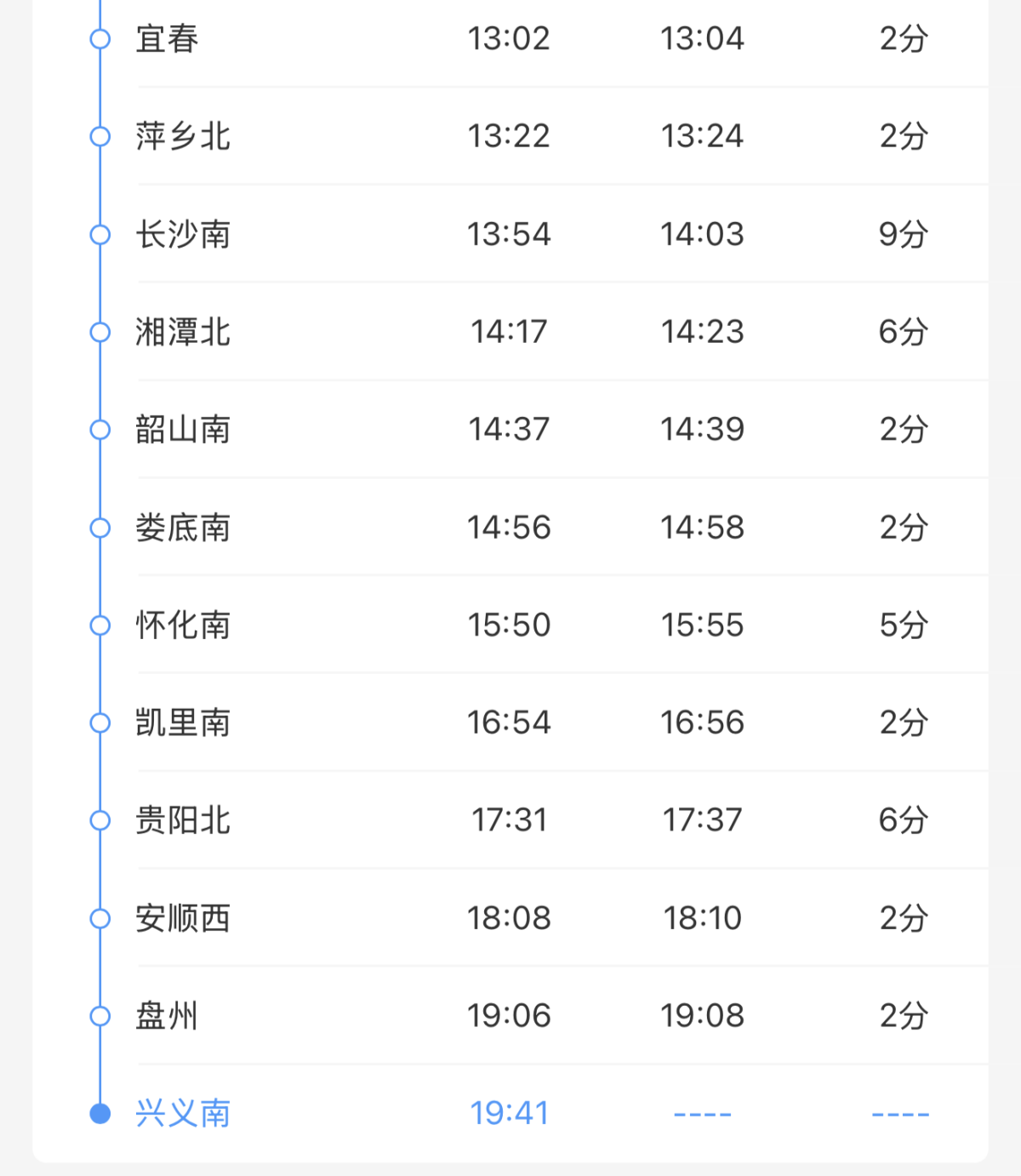 根据列车时刻,这趟全新的宁海至兴义南G2332次,上午7:00从宁海站始发,7:45到达宁波站,7:47从宁波站开出,主要经杭州南、金华、南昌西、长沙南,17:31到贵阳北站,17:37从贵阳北站开出,最终于19:41到达兴义南站,全程2194公里,历时12小时41分钟,其中铁路宁波站至兴义南全程2122公里,历时11小时54分钟。