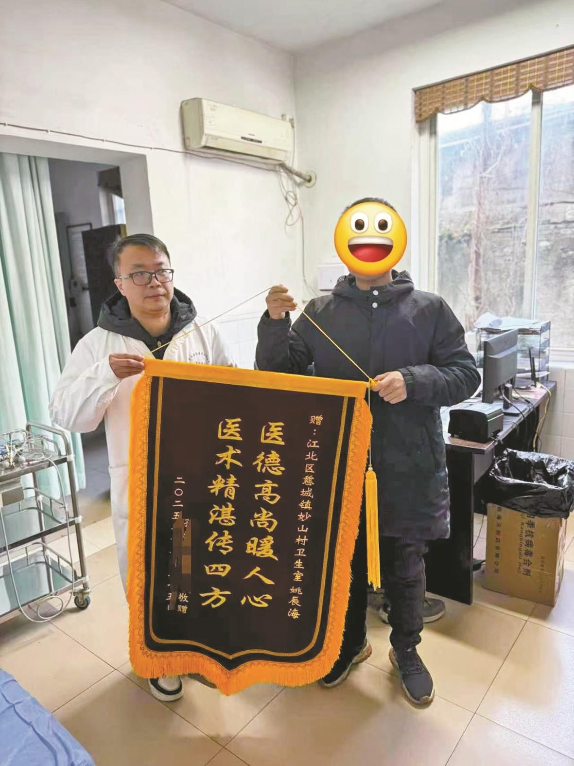 近日,江北区慈城镇中心卫生院妙山村卫生室,全科医生姚辰海的诊室里,又多了一面锦旗。送来锦旗的徐阿姨拉着外孙的手,向姚辰海致谢:“姚医生,我们一家信您!以后全家人的健康,都托付给您了!”