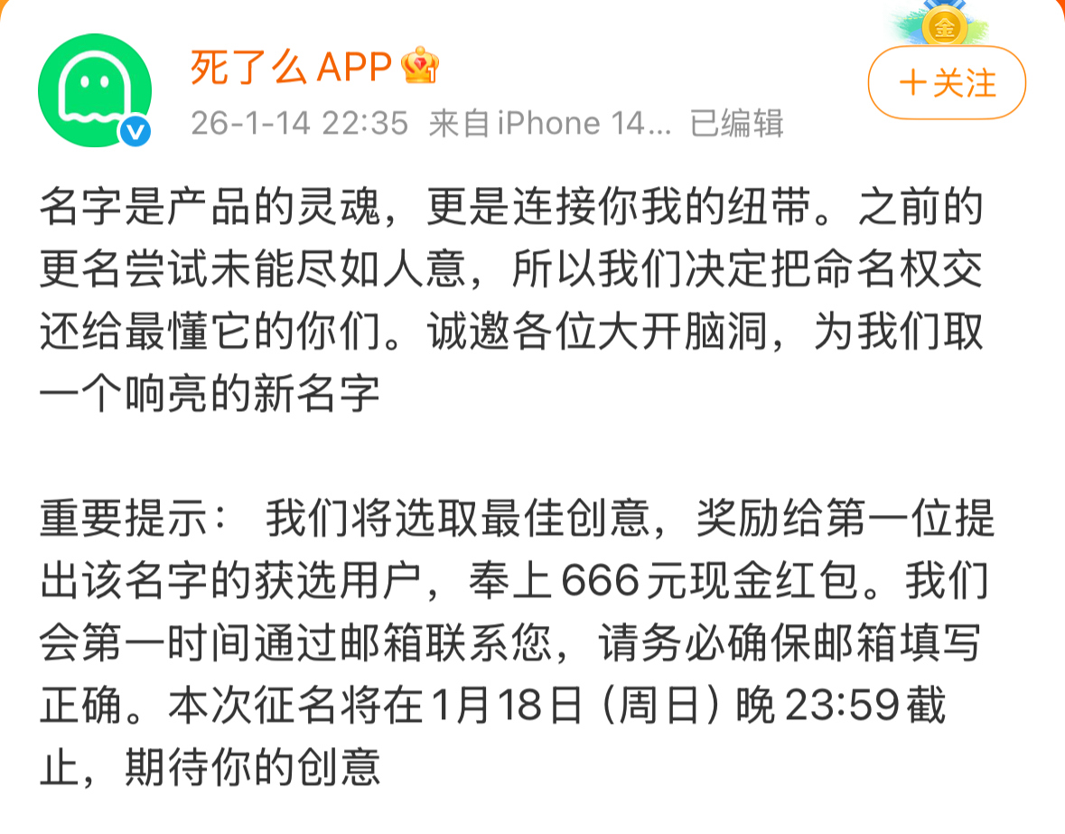 1月14日晚,“死了么”APP在微博发文征集产品新名字。