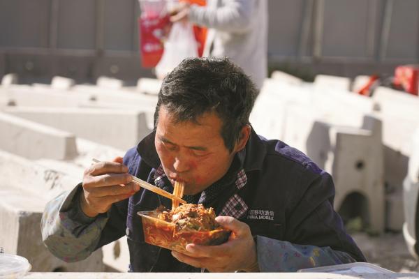 建筑工人吃得津津有味。