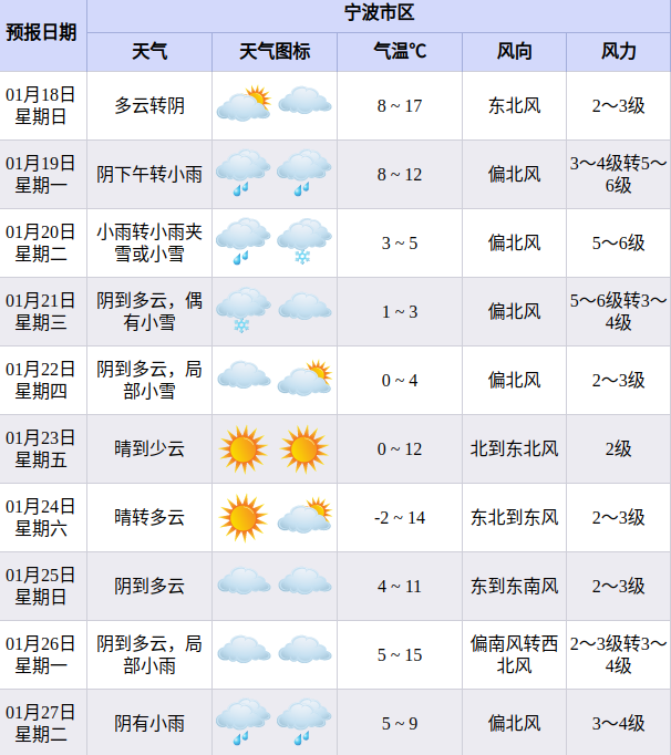 气温方面,最低气温今天到明天8℃,20日到24日-2℃~3℃,25日起4℃~5℃;最高气温明天17℃,20日到22日降至3℃~5℃,其余9℃~15℃。