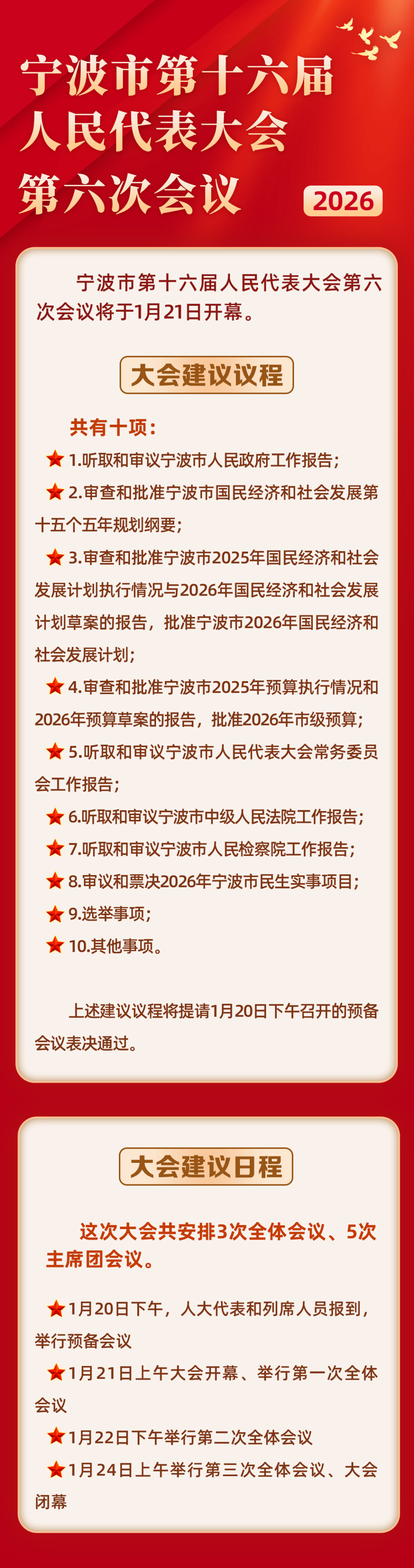 决定列席人员为:不是本届市人大代表或省市政协委员的在甬省十四届人大代表,市级有关机关和团体负责人,区(县、市)监委和法检两院主要负责人,市属国企负责人,有关高校院所、部省属驻甬单位、驻甬部队、外地宁波商会负责人。同时,将邀请部分“宁波市荣誉市民”列席、组织公民旁听。