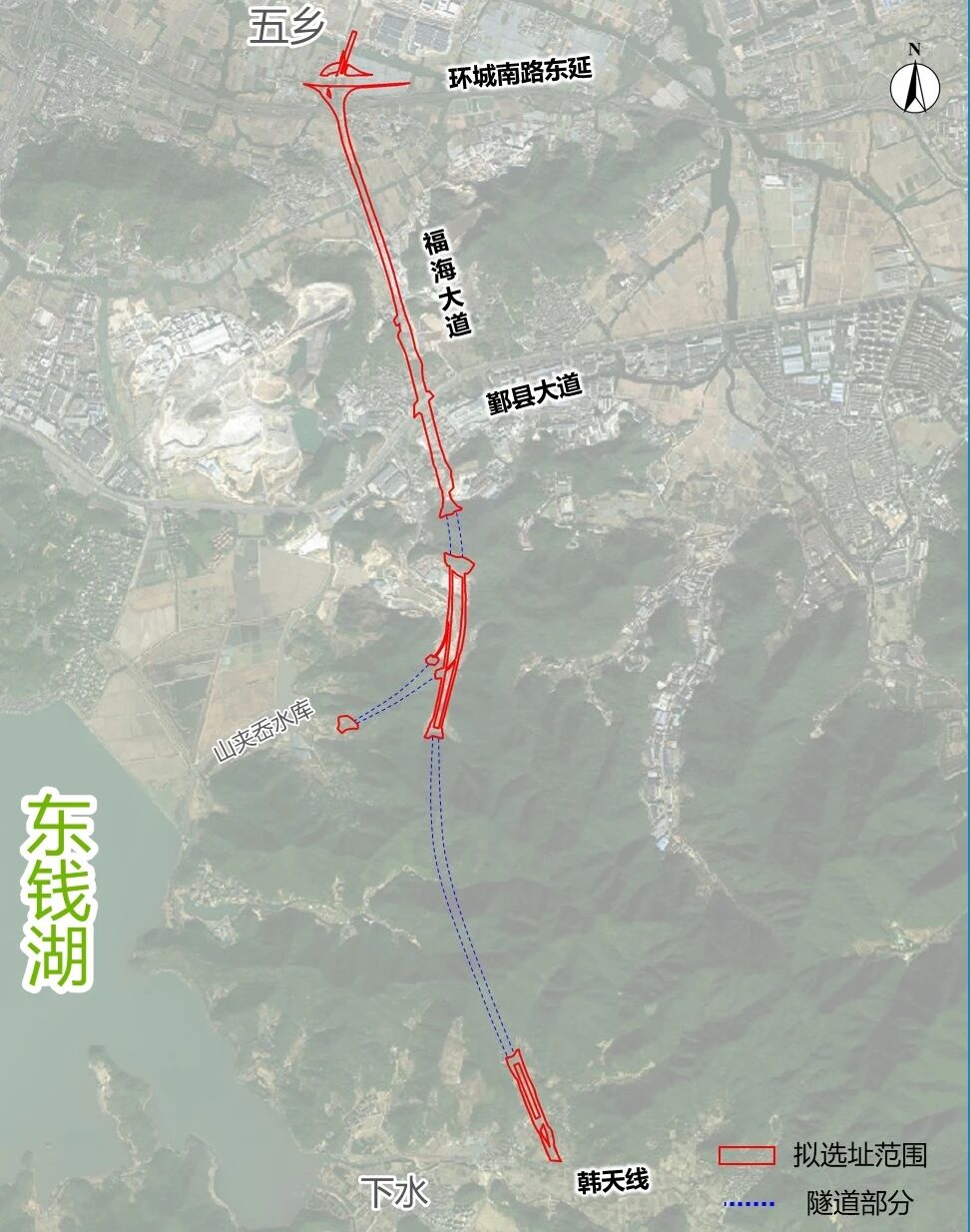 福海大道一期北接已在建的环城南路东延、南至韩天线,长约6.5公里。选址图示如下: