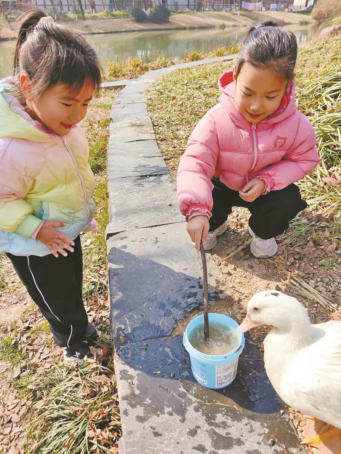 孩子们喂养小鸭子。受访者供图