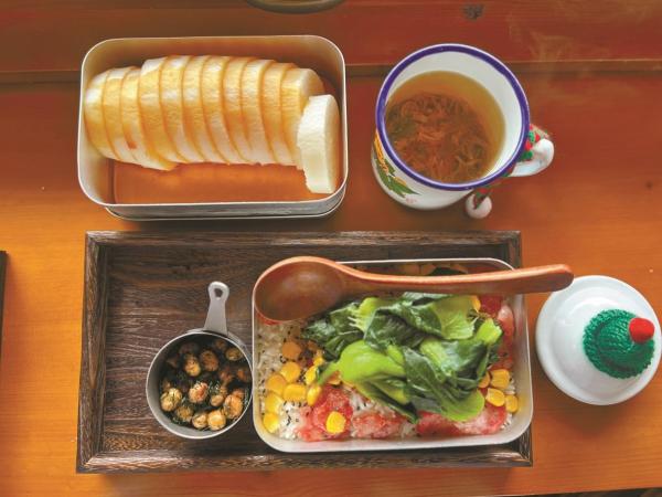 店内的食物里藏着些巧思。学生时代的铝制蒸饭盒里,腊肠、青菜、玉米与米饭一同焖煮,掀开木锅盖的瞬间,柴火香混着饭菜香扑面而来;兰花香干、茶叶蛋是放学路上的滋味;灰汁团是夏天母亲做的小点心;红薯片则来自自家地里种的番薯。