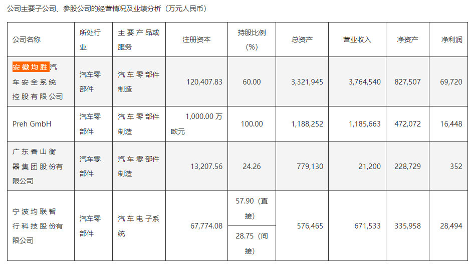 资料显示,安徽均胜由均胜电子于2021年10月在安徽合肥肥西县投资设立的子公司,是均胜电子汽车安全业务的核心平台。
