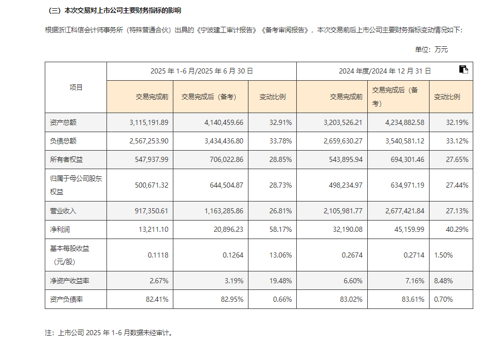 根据审计报告,本次交易完成后,截至2024年12月31日,宁波建工的总资产规模较交易前将相应提高32.19%,达423.49亿元;公司营业收入、净利润分别提高27.13%、40.29%。