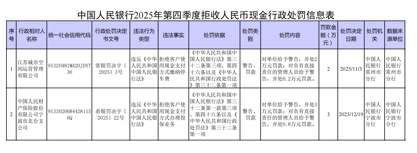 2025年第四季度,中国人民银行对2家核实为拒收人民币现金的单位及相关责任人依法作出经济处罚。广大经营主体应强化法治观念,尊重公众支付选择权,共同打造和谐现金流通环境。
