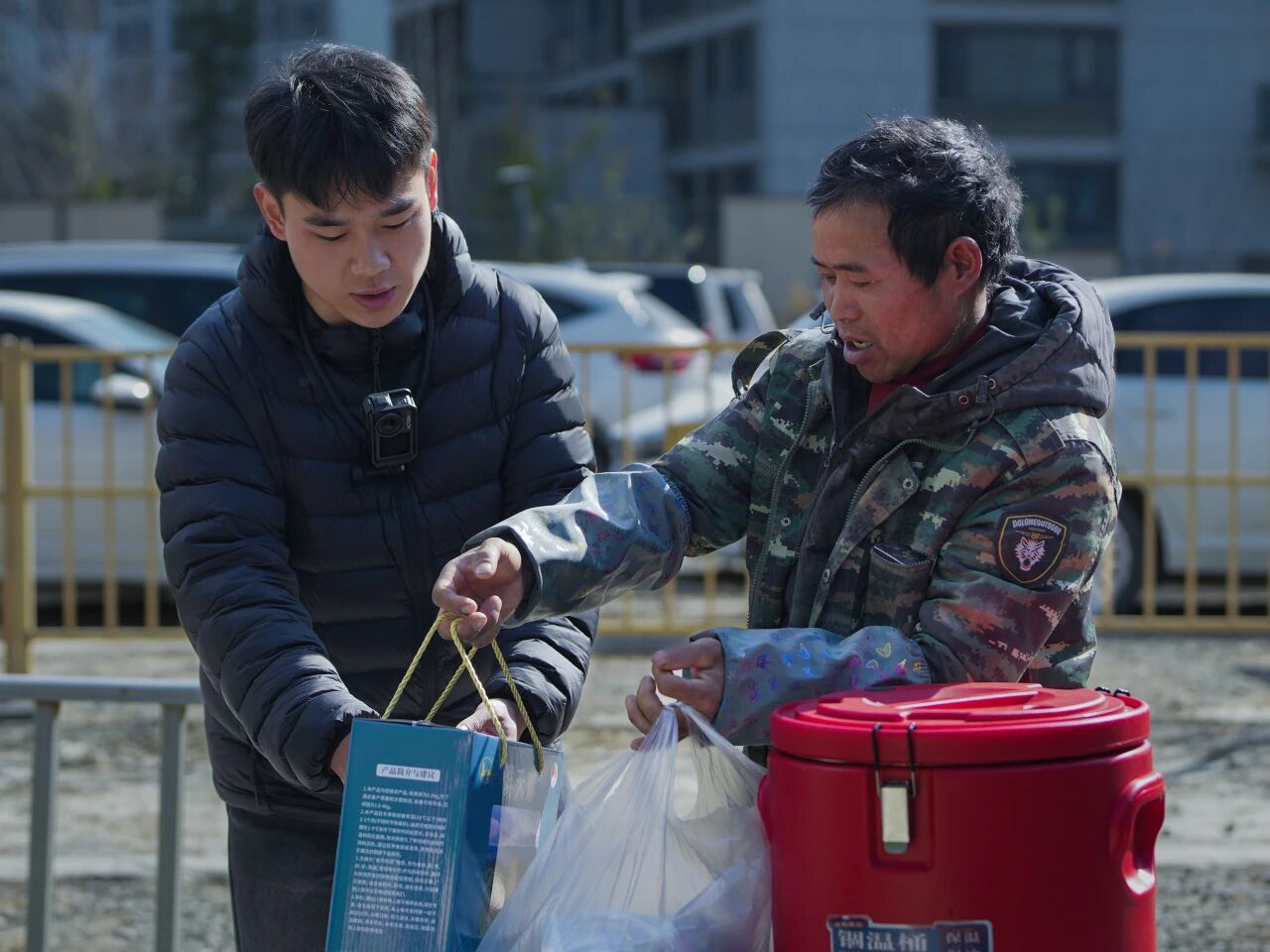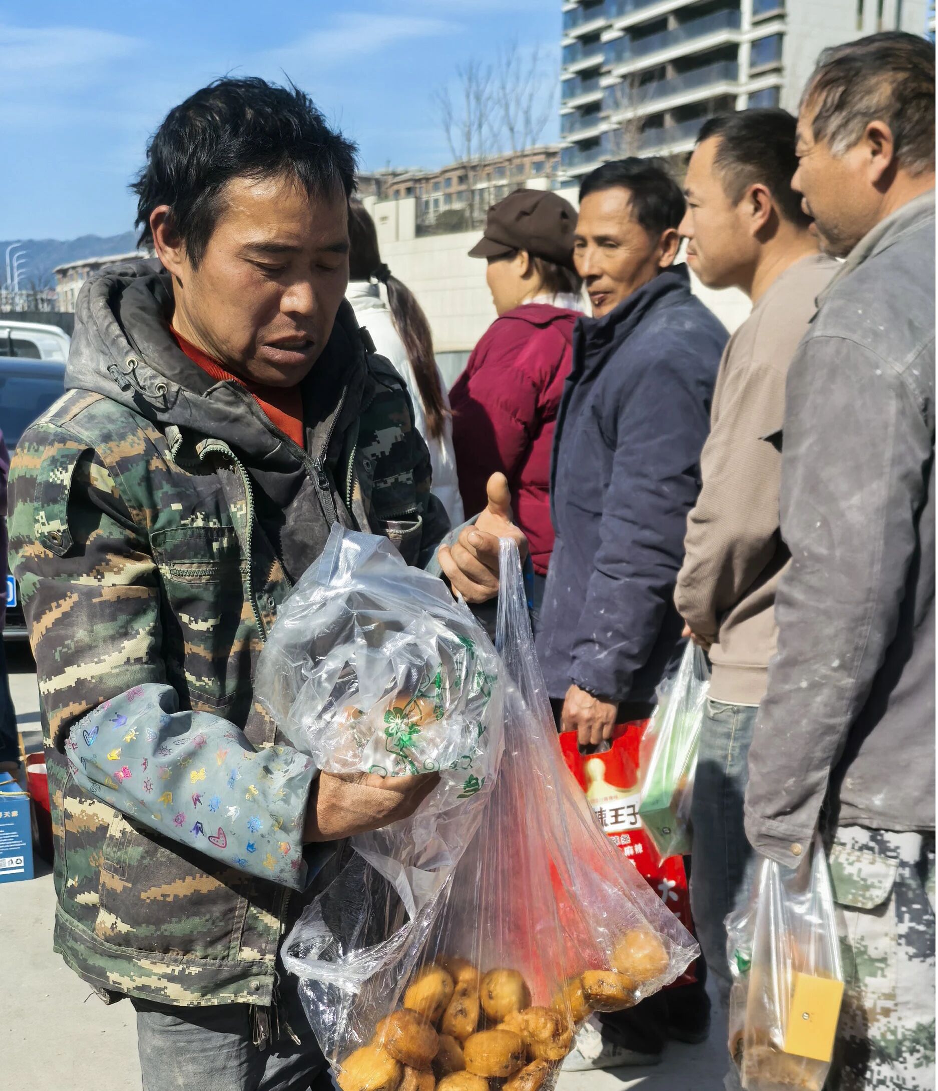 “贵州子涵”曾信金为工友分发农特产品