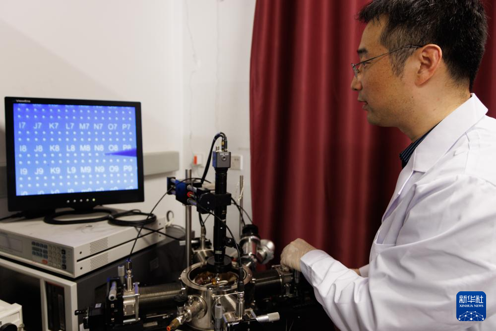 这是1月21日在中国科学院物理研究所实验室拍摄的探针台与等待测试的铁电电容器样品。