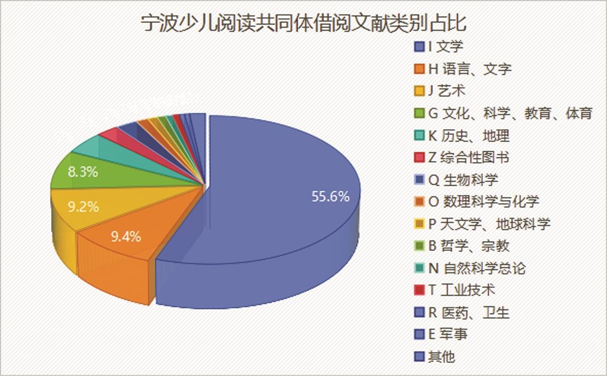 这一年,在少年儿童的借阅偏好上,文学类(I类)占比最高,达55.6%;其次是语言、文字类(H类)占比9.4%;第三是艺术类(J类),占比9.2%。