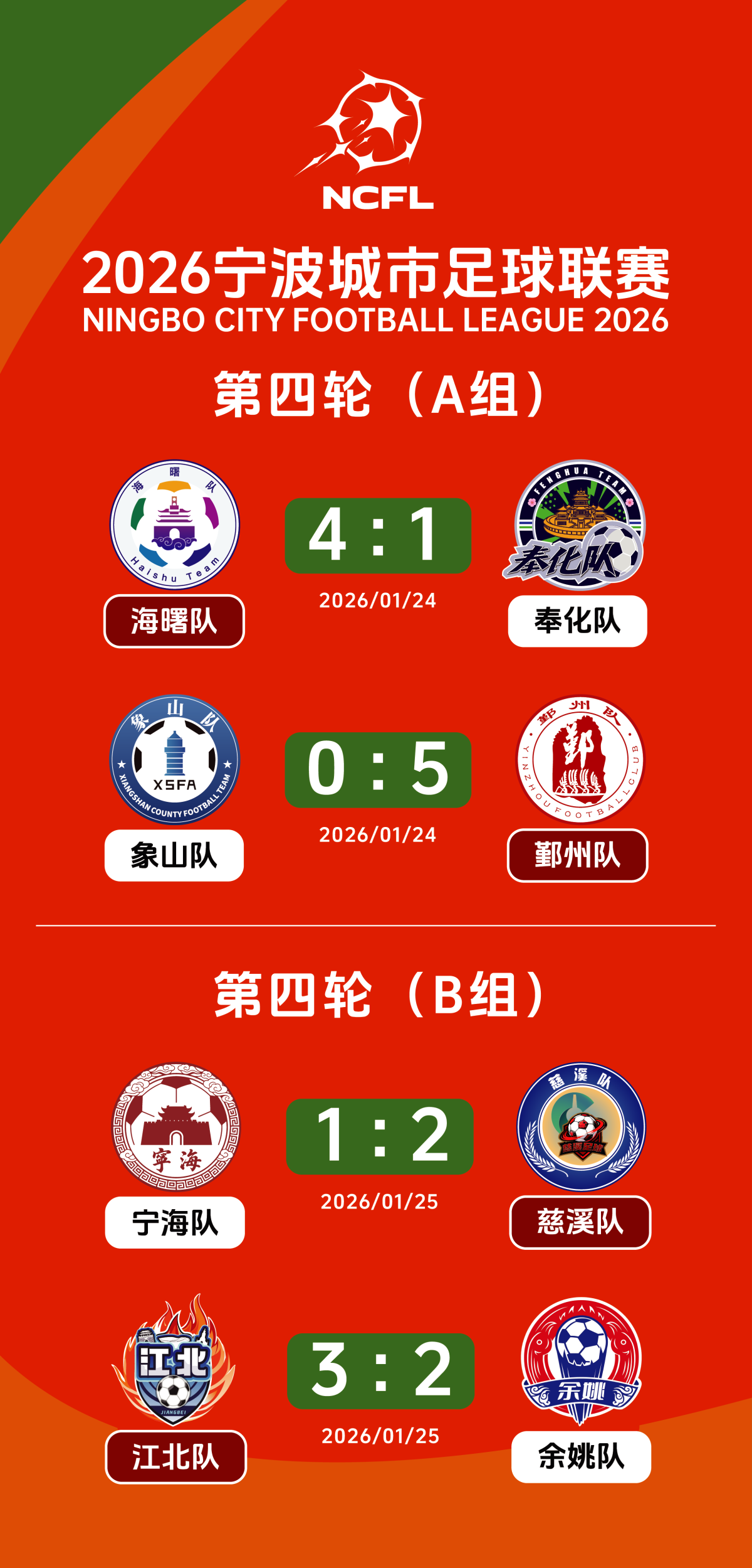 1月25日下午,2026宁波城市足球联赛完成第四轮B组的两场争夺:江北队主场3比2战胜余姚队后,以两胜两平的战绩率先从B组出线;慈溪队2比1战胜宁海队,慈溪队最后一轮只要不输球即可出线。