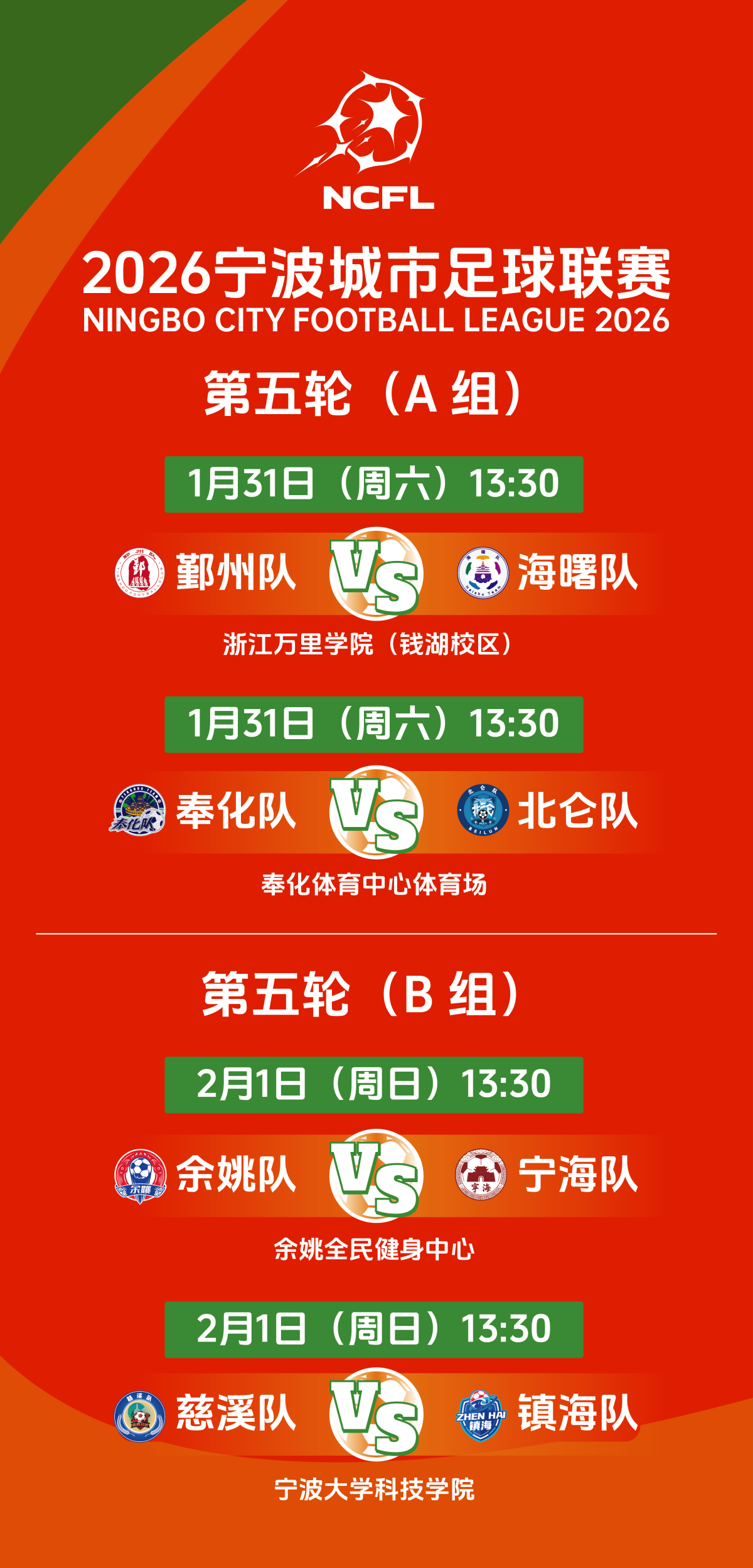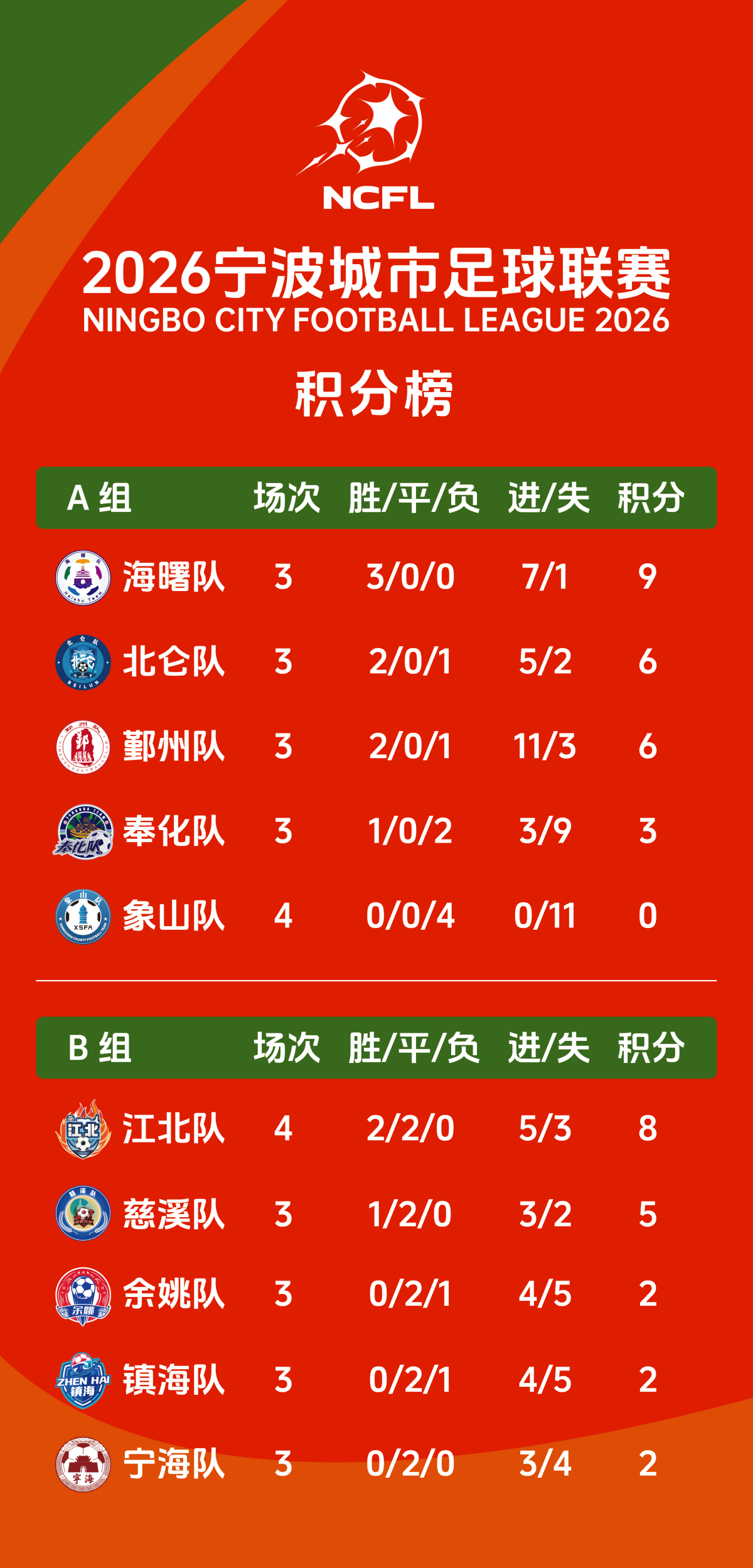 海曙队开赛两连胜领跑积分榜,奉化队上轮负于鄞州队,输掉出线关键战役。本轮相遇,海曙队主场4比1战胜奉化队,提前一轮出线。