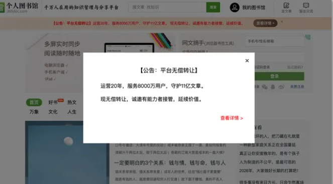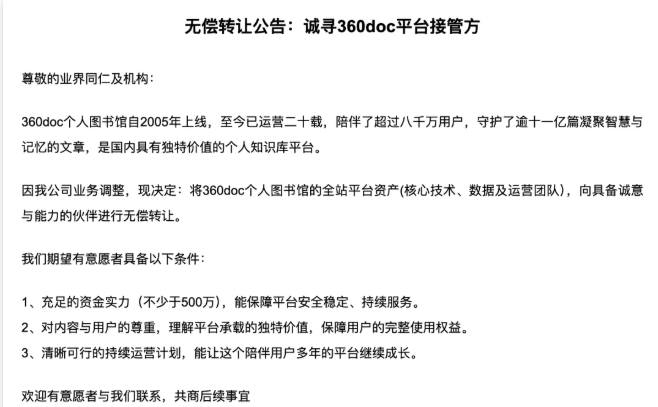 根据360doc个人图书馆1月24日发布的公告,因公司业务调整,现决定将360doc个人图书馆的全站平台资产(核心技术、数据及运营团队),向具备诚意与能力的伙伴进行无偿转让。