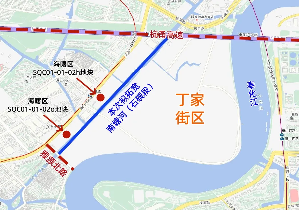 本月9日,海曙资规部门刚刚对该街区内首个落地开发项目的规划方案进行了批前公示,其所在SQC01-01-02h地块及当天成交的该街区内第二宗出让土地SQC01-01-02o地块,就在本次拟拓宽河段西岸。