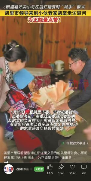 同样感受到温暖的还有1500多公里外的杨毅的家人。在杨毅老家贵州黔东南州凯里市,市领导专程前往慰问其家人。