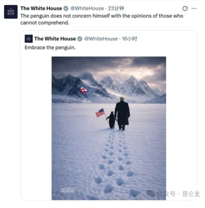 白宫24日在社交媒体平台X上发布了一张人工智能合成图片,内容是美国总统特朗普与一只举着美国国旗的企鹅一起走在冰天雪地中,远处冰原上还插着一面丹麦自治领地格陵兰岛旗,图片配文“拥抱企鹅”。