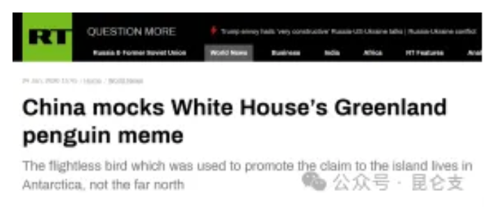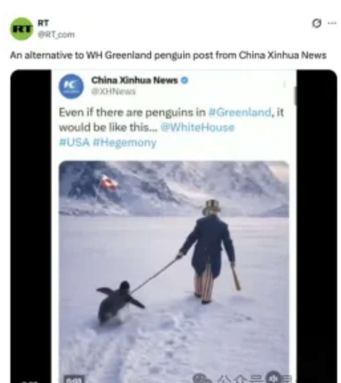 今日俄罗斯一天之内转发三次,还发表题为《中国借格陵兰企鹅梗图调侃白宫》的报道。