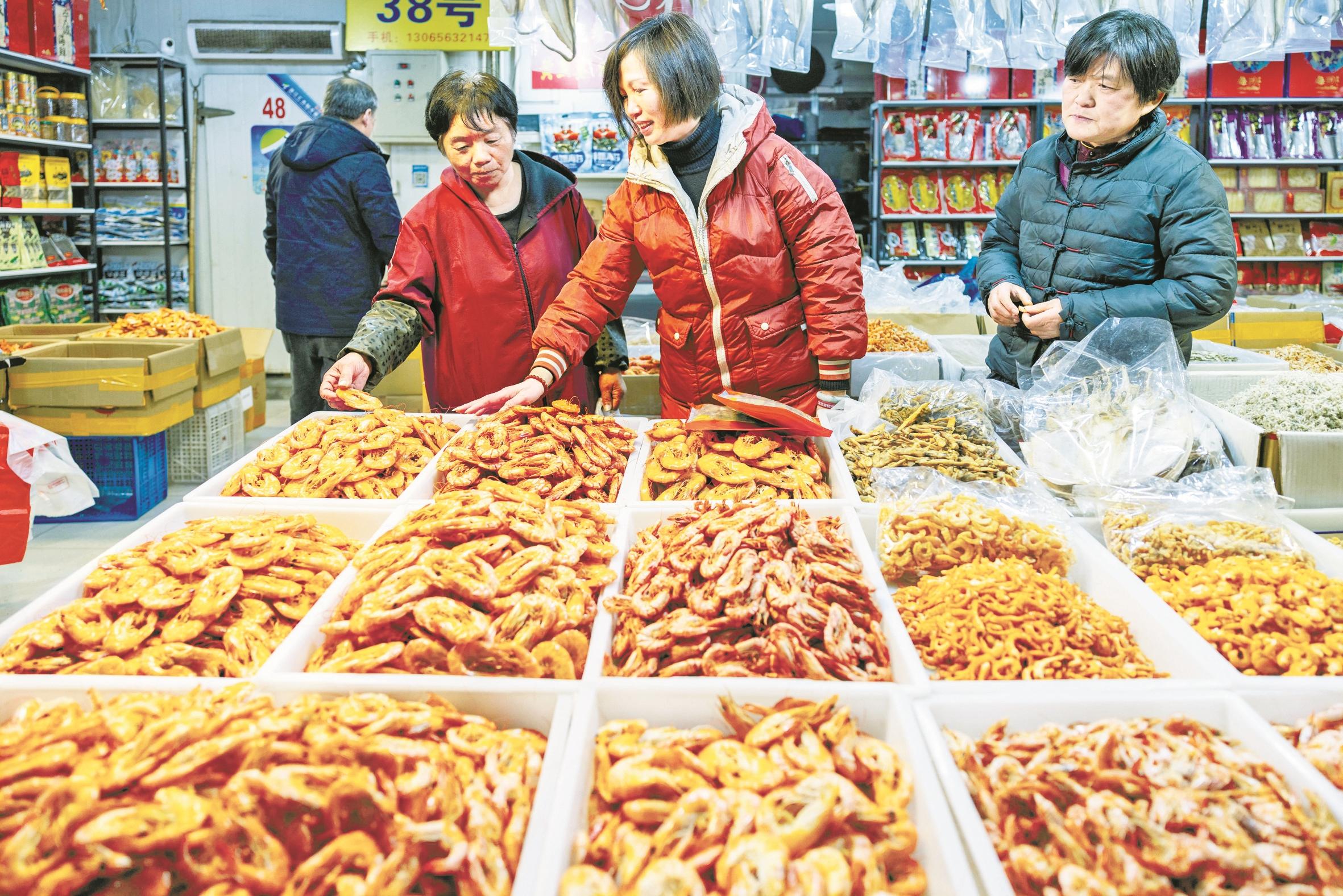 新春脚步将近,作为华东地区重要的海鲜集散中心,宁波农商发展集团下属宁波水产品批发市场人气旺盛。市场内,除了梭子蟹、黄鱼、鲳鱼等海鲜产品,还有虾干、墨鱼干、鳗鲞等各类干货。不少商家还专门推出了各式产品组合的新春礼盒,以满足市民节前多样化的采购需求。(甬派客户端宁波日报 李越 王佳辉 摄)