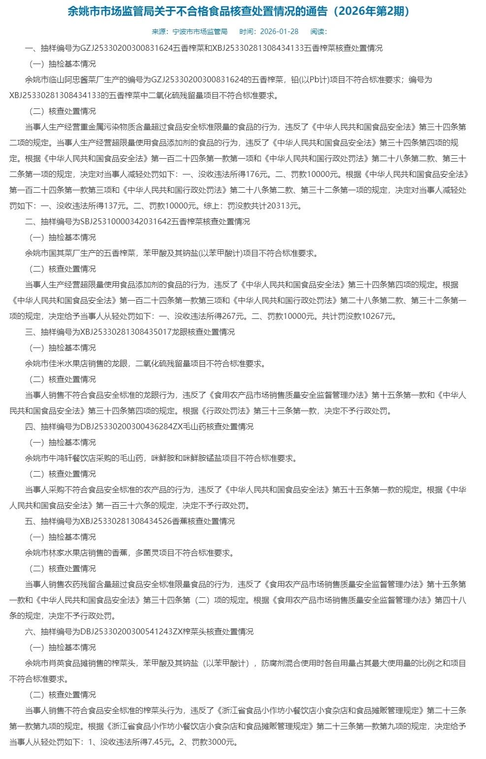 其中,余姚市临山阿忠酱菜厂生产的两批次五香榨菜,分别被检出铅(以Pb计)项目和二氧化硫残留量项目不符合标准要求。罚没款共计20313元。